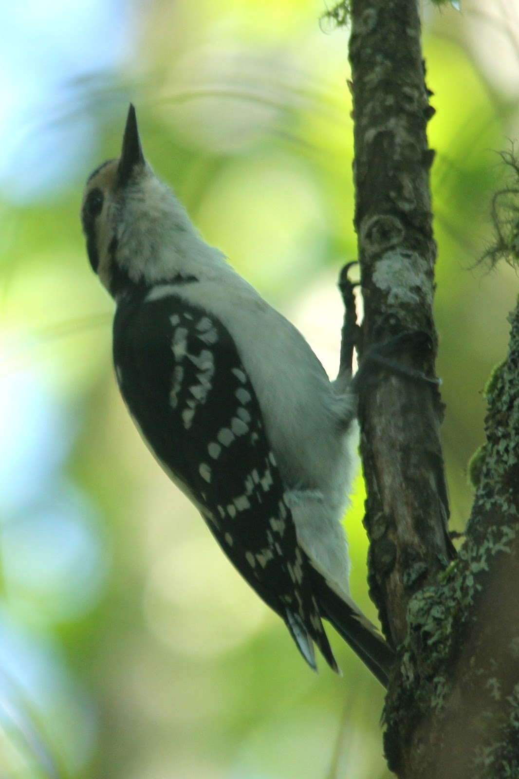 A Hairy Woodpecker having breakfast in the woods.